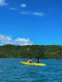 Paddling slowly on the calm water allows you to observe various marine creatures up close. Colorful coral reefs are faintly visible underwater, and small fish and shrimp swim around the kayak. If you're lucky, you might even see adorable dolphins leaping out of the water.