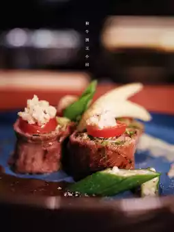Using filet, a low-fat cut from the tenderloin, with a delicate beef flavor. Charcoal grilling intensifies the aroma. The meat is tender and fine-textured, soft and smooth in the mouth. Paired with vegetables, it’s refreshing, juicy, and balances the richness.