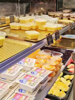 The dessert counter 😋 is packed with treats like cakes 🍰, cream puffs, and puddings 🍮. Be sure to save some room for dessert! 😆