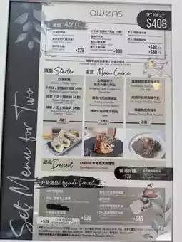 The $408 set meal for two includes soup/salad, appetizer, main course, dessert, and drinks, with upgrades that are very economical!