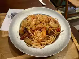 👏🏻 This time, I tried their special soda drink🍹, spicy fresh tomato shrimp spaghetti🍝, and vanilla ice cream🍨. The drink was delicious, with a unique taste and color that surprised me; the ice cream was smooth and sweet, paired with chocolate sauce, which tasted great; the spaghetti was coated with rich and smooth tomato sauce that absorbed the fresh flavor of the shrimp, tangy and spicy, very tasty, with tender and flavorful shrimp, and a generous portion that left a lasting impression.
