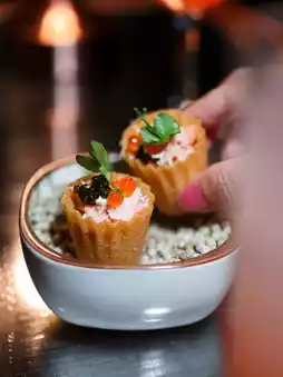A crispy tart shell shaped like a mini cup holds fresh salmon mousse✨, garnished with caviar and salmon roe to add a savory flavor, perfectly bite-sized😚