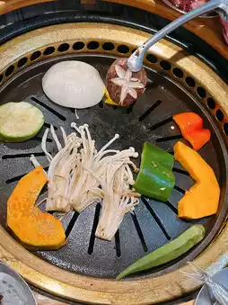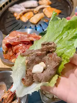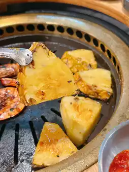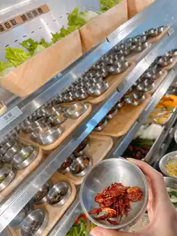 The self-service area offers appetizers, salads🥗, drinks🥤, and desserts🍧 for you to help yourself. It is clean and well-organized. There are many kinds of Korean appetizers, homemade kimchi, and spicy marinated rice crabs worth trying. There are also various fresh vegetables and lettuce to accompany the grilled meat🥬. Don’t miss the sweet and juicy grilled pineapple🍍. Drinks include soda, yuzu honey, and hot tea🍵. Desserts include vanilla ice cream🍨, brownies, and cream puffs🍰, making for a very satisfying meal.