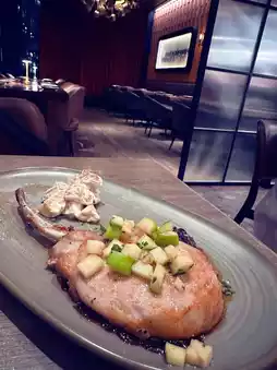 Recommended dishes include bone marrow toast, roasted pork saddle with apple sauce, lobster mac and cheese, and caramel pudding.