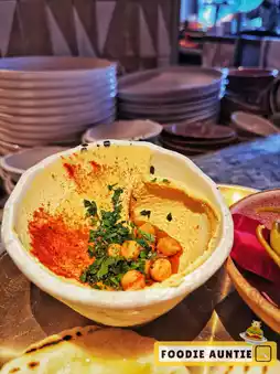 🍞 At the start, they always serve a special platter, which is a nice surprise! It includes smoked chickpea puree, flatbread, and pickles, with a unique and slightly sour taste that whets the appetite and prepares you well for the lunch ahead. 😆