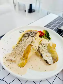 We ordered two lunch dishes: a sunny-side-up egg with double cheese beef burger and sole fillet with mentaiko cream sauce. The burger features thick double cheese and juicy beef, with the runny yolk of the sunny-side-up egg adding a rich flavor to the whole burger. The sole fillet is tender and delicious, paired with the mentaiko cream sauce for a rich layering of flavors.