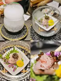 After the bubble burst π«§, the flounder sashimi appeared right before my eyes. Thinly sliced πͺ flounder wrapped around delicate white shrimp π¦, paired with a touch of bamboo charcoal salt π§ and precious caviar, plus fragrant flower spike shiso, π the texture and flavor layers were incredibly rich!
