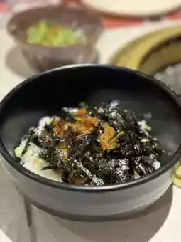 Several BBQ items are also highly recommended, including the chewy and juicy squid sausage🦑, grilled pork jerky that is salty-sweet with a slight char adding aroma, cooked fish crisps, cold tofu salad, and pepper mala chicken wings🍗. The golden kimchi💛 is sour, sweet, and refreshing, very appetizing🥗.