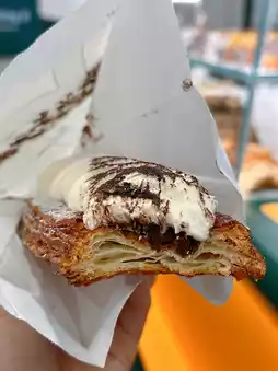 🌟 The Napoleon Caramel Mille-Feuille Tart is definitely a crowd favorite. The outer layer is baked to a crispy golden brown, while the inside is filled with sweet, smooth custard infused with caramel aroma 🥖 The Mentaiko Hot Dog is very soft, wrapped with plenty of mentaiko sauce, offering a rich, savory, and fresh flavor 🍰 The Tiramisu Puff features rich Italian mascarpone cream with a slight coffee bitterness paired with crispy layered puff pastry—so indulgent 😜 The Chocolate Flat Croissant is buttery and fragrant, filled with rich chocolate sauce, also quite delightful 🍫