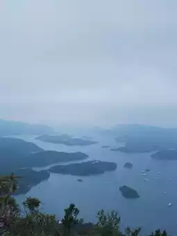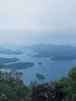 At the summit, there is a pile of large rocks for resting and taking photos. On the left, you can see the High Island Reservoir, Tai Tau Chau, Kau Sai Chau, Kiu Tsui Chau, and Ngau Mei Chau forming the "Thousand Island Lake." On the right, Ma On Shan is visible in the distance. The view is extremely open. Unfortunately, the weather was poor that day, with clouds and strong winds, so we only stayed for twenty minutes before leaving.