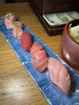 Superior Tuna Five-Point Sushi Platter (Snake Belly Toro, Fire-grilled Golden Triangle Toro with Shredded Onion Toro, Fresh Tuna Medium, Akabo) Silver Snapper Miso Grill