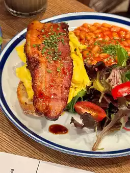 Thick sliced bacon is full of charred aroma, red and red looks super tempting, yellow robe scrambled eggs are super smooth and tender, with sour toast and fresh tomato sauce baked beans, super rich taste, very satisfied after eating