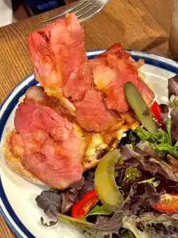Homemade American-style corned beef is firm and flavorful, served with fluffy potato salad and sourdough bread, and salty, traversing the streets of New York in one bite