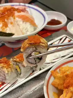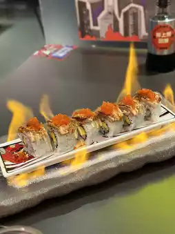 The flaming effect is perfect for photos! The caramelized surface of the salmon is crispy and delicious. The roll contains tamago, crab sticks, and cucumber, and with the addition of salmon roe, each bite offers a rich texture.