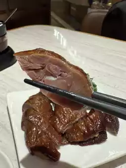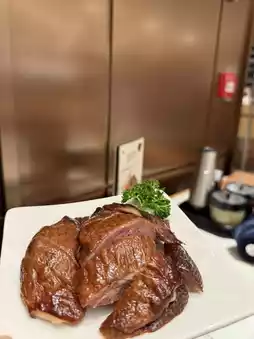The duck is flavorful with a nicely colored surface, somewhat resembling cured duck. It’s chewy but not too tough.🪨