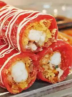 Crispy Prosperity Red Rice Rice Noodle Roll 👍 looks bright red and super lucky, with a soft outside and crispy inside double texture. Filled with shrimp bursting out and crispy fried netting ✨, fresh and tasty with rich layers!