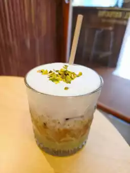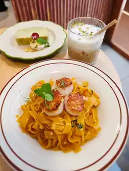 The food, drinks, and desserts are all quite good. I ordered lobster sauce wide egg noodles with pan-seared scallops; the handmade pasta has a chewy texture, like it~ Pistachio duo: pistachio latte + pistachio Basque cheesecake, with a pistachio aroma that’s not too sweet.