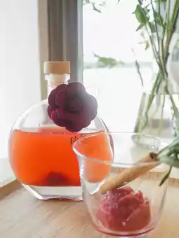 Served in a perfume bottle-like glass bottle, with rose-shaped ice and vanilla branch decoration.