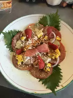 A rare Indian salad made with strawberries, tomatoes, and corn kernels, combined into a rich-flavored salad, along with cashew nuts and onions, topped with a mint-scented dressing and cheese crumbles. It feels very refreshing and is a very elegant appetizer.