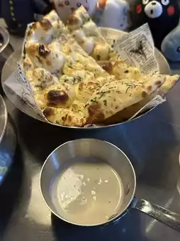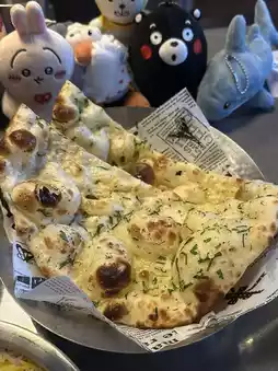 Crisp and well-baked garlic naan, with a rich charcoal-grilled flavor. Dipping it into the eggplant curry sauce adds another layer of taste.