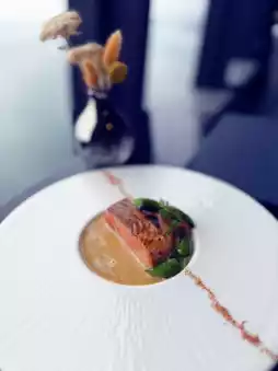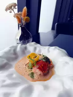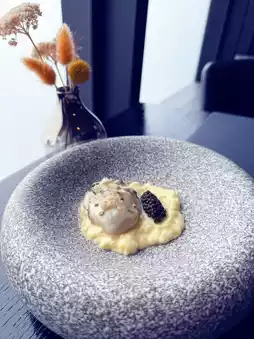 The half-cooked French oyster is thick, meaty, and plump, topped with garlic butter and chives. At the bottom is a sauce made from tapioca and cassava starch, paired with precious Chinese caviar. The presentation is elegant and beautiful, and the taste is excellent.