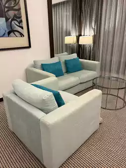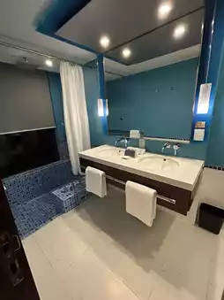 The ocean view rooms feature a spacious bathtub and a calming design with a light blue color scheme! When you open the curtains, you can enjoy the ocean view from the room!