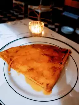 🥠 Crêpe Suzette: Thin and soft crepe drizzled with orange butter sauce, flambéed with orange liqueur for a sweet and rich aroma.