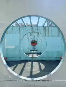 Rows of light blue circular open walls. Under the sunlight, the shadows they cast create their unique feature.