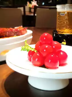 The tomatoes are sweet and juicy, paired with the tangy and sweet plum sauce, offering a refreshing taste perfect as an appetizer.