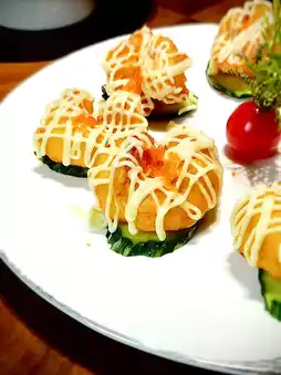 The prawn balls are fried to a golden crisp with a bouncy interior, paired with wasabi salad sauce for a delicious and appetizing dish.