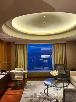The streamlined glass curtain wall building stands side by side with IFC. The lobby features understated luxury with marble walls and art installations, and a butler hands you a welcome drink at check-in (attention to detail is perfect!)