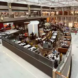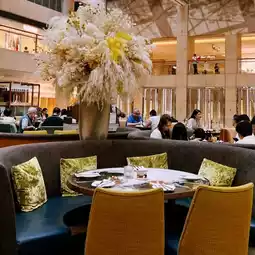 The moment you step into Café Landmark, you are immediately attracted by its grand design. The ceiling inside is high, featuring a modern style with glass and wooden structures. Sunlight streams through the skylight, creating a bright and cozy atmosphere. The surrounding decor complements the upscale boutiques, making you feel like you are in a fashionable urban oasis. The seating layout is comfortable, with round sofas and brightly colored cushions adding a lively touch.