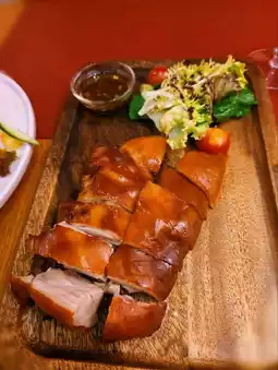 The suckling pig is slow-cooked for 48 hours. The skin is roasted to be crispy while locking in the tender meat inside. The color is bright, with a clear distinction between fat and lean parts. Served with olive salsa, it’s very appetizing😄. This is also the signature dish here🍽.