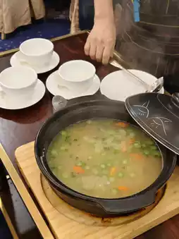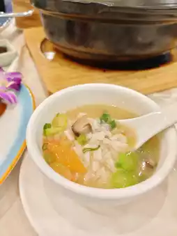 A large clay pot emits a fragrant aroma, with a soup base made from lobster, enough for four people. Added ingredients include clam meat, mushrooms, carrots, and celery to cook the congee, delicious and appetizing~