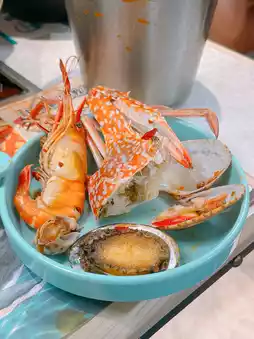 Seafood ๐ set includes ๐ฐ fresh oysters ๐ฆช abalone, US clams ๐บ๐ธ, sand clams, blood cockles, prawns, grass prawns, big head prawns ๐ฆ three-spot crabs, blue flower crabs ๐ฆ crispy carp slices, sand mullet fish ๐ fish maw, scallops, sea snail slices, flower snails ๐ The oysters are plump and large ๐ฑ with smooth and tender meat ๐ฏ The two types of crab have fresh, sweet, and firm meat ๐ plus the crab roe is bright orange and flavorful ๐คค The abalone is chewy ๐ The prawns are fresh, bouncy, and delicious ๐