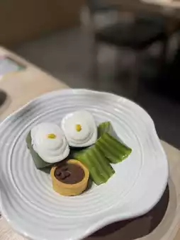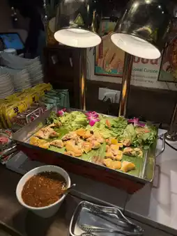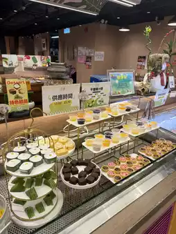 The self-service area has a wide variety, including Hainan chicken, fruits, various types of meatballs, vegetables, sea shrimp, desserts, and sweet soups—everything you could want. The desserts and sweet soups come in many varieties.