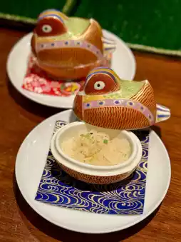 The signature dish features chicken grilled to half-cooked perfection, served with mullet roe and vinegar jelly, enhancing the flavor.