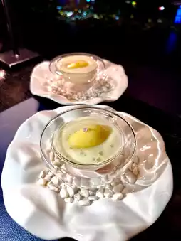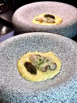 Rich, sweet, and slightly salty Chinese caviar. Small, plump, and fresh French half-cooked oysters. Onion garlic butter sauce. Thick and smooth egg yolk salad dressing with sago pearls.