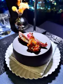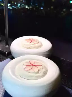 Japanese Miyazaki A4 slow-cooked Wagyu sirloin with an explosion of fat in every bite. Grilled sauce. Lemon jelly. Crisp and mildly sweet radish with sour pickled radish cubes. Served on a bed of slightly crispy pork tail meat.