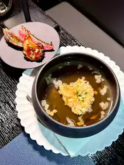 Rich sweet vinegar sauce that doesn’t overpower the milky flavor of the tender and springy slow-cooked Bresse pigeon, paired with dried Iberico ham thigh with a texture similar to coconut jelly, and a palate-cleansing maitake mushroom black pepper clear soup.