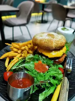 🍔 Black Truffle Double Cheese Beef Burger with Fries: Thick and tender Angus beef paired with black truffle sauce and semi-melted cheese, complemented by crispy fries—each bite is indulgent and satisfying.