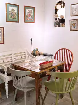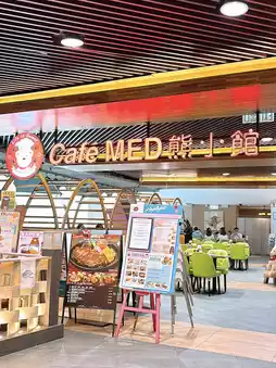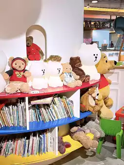 The tables, ceiling lights, and kids' corner are all filled with bears