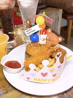 The fries, fried shrimp, fried chicken wings, and burger are wrapped with a birthday hat