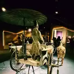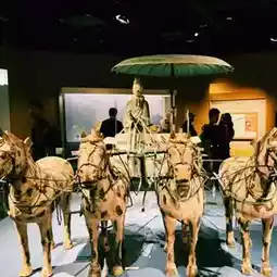 The exhibition features 3 authentic Terracotta Warriors, including a senior military officer figure, a kneeling archer figure, and a Liao-style figure. The chariot with horses in image 56 is a replica.