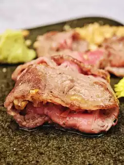 American 🇺🇸 Angus thinly sliced roll was super flavorful😋, tender beef wrapped around fried garlic🧄 and chopped scallions🌱, very aromatic and delicious✨.