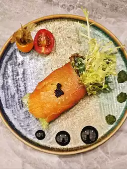 The signature salad🥗 was eye-catching, with large pieces of smoked salmon wrapped around fresh, crisp salad greens🥬, topped with black fish roe✨, delivering a rich, salty, and fresh taste.