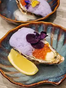 Seasonal caviar oysters🦪 were topped with soy-marinated salmon roe🔴, bursting with the fresh flavors of oysters and salmon roe🌊, full of ocean vibes💙.