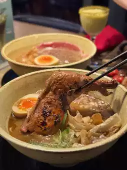 The chicken thigh🍗 is seasoned with Japanese soy sauce, pepper, and slow-cooked at 60°C for 2 hours, then grilled until the skin is slightly charred. The texture is super tender and juicy. The broth is made from chicken white broth with added Japanese soy sauce and black garlic oil, rich in flavor. The ramen is well-coated with sauce and served with a soft-boiled egg in broth, fried burdock, scallions, and onions, enhancing the taste.