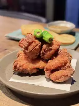 Freshly fried chicken that is crispy on the outside, tender inside, and juicy, with a subtle sake aroma.