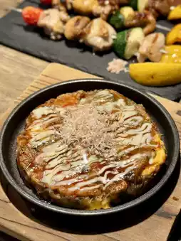 The okonomiyaki is soft in texture and generously filled with oysters and octopus, offering a fresh and layered flavor. It’s even more delicious with sauce, mayonnaise, and bonito flakes.